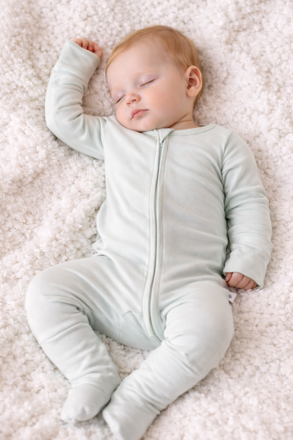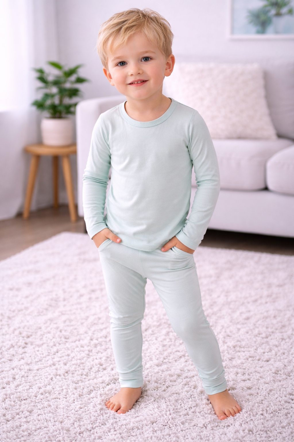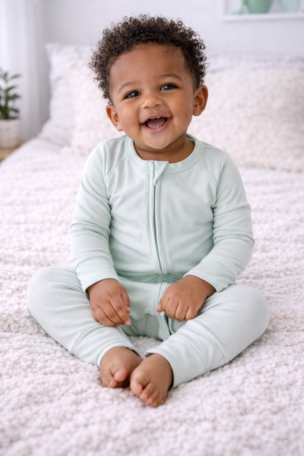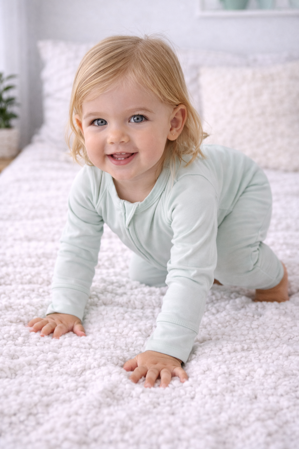 Made from 95% Viscose from Bamboo and 5% Spandex, our fabric is buttery-soft, breathable, and designed to stretch gently as your little one grows. Each piece is sustainably crafted for comfort that lasts — from playtime to sweet dreams.