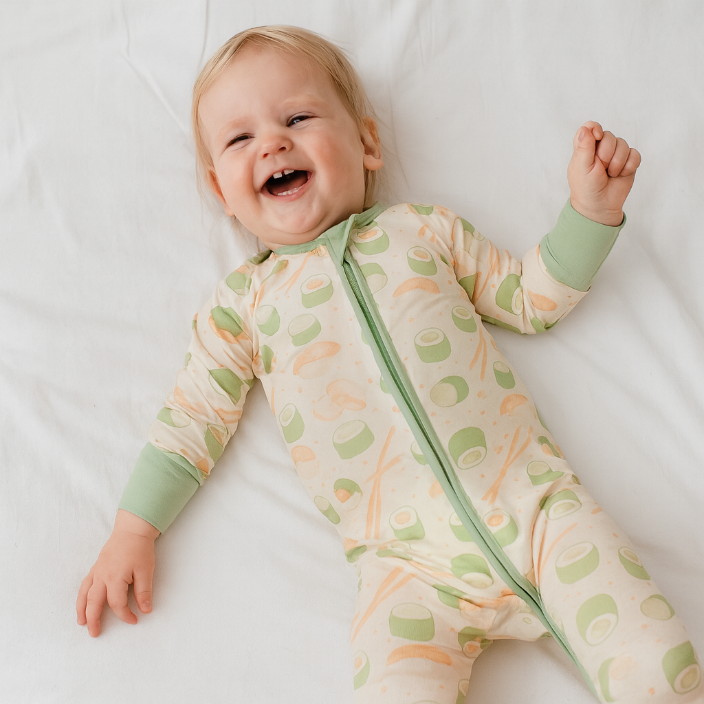 Made from 95% Viscose from Bamboo and 5% Spandex, our fabric is buttery-soft, breathable, and designed to stretch gently as your little one grows. Each piece is sustainably crafted for comfort that lasts — from playtime to sweet dreams.